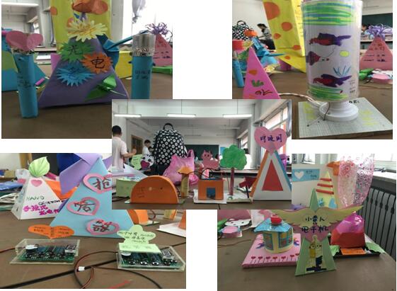 在设计制作教具过程中同学们遇到了许多的困难,并及时请教老师。在老师的讲解与帮助下,大家又继续开始了自己的小创作。教具制作完毕后,老师让大家发挥自己的想象力,为自己所做的教具设计制作精美的装饰。以下是同学们的精美作品