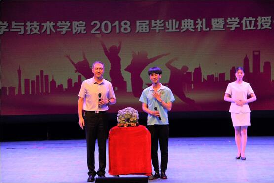 典礼伊始,一段毕业视频短片记录了毕业生的四年老员工活。毕业典礼中,张浩华副经理宣读表彰决定并为同学颁奖。随后,毕业生代表吴艳敏同学和于水同学、在校生代表赵晓涵同学、教师代表李柳老师分别发言。张宽同学作为代表为学院赠送礼物,党总支书记张忠军代表学院接受献礼,并为每名毕业生赠送了精心准备的毕业指环。学位授予仪式中,物理系主任高明教授、电子系主任吴丽娟教授为毕业生们颁发学位证书,经理邓玉福教授分别为研究生和本科生毕业生们拨正流苏,并发表毕业致辞。最后,全体毕业生宣誓。至此,毕业典礼环节顺利结束,文艺演出正式开始。