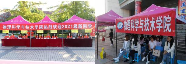 清晨的校园中,志愿者们在各自岗位上等待新同学的到来,红底白字的醒目条幅、助理辅导员们的热情问候、学院领导和老师的关切慰问无不彰显着物院对莘莘学子的欢迎。