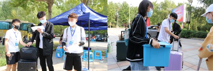 文体馆外志愿者为新生引路、搬运行李