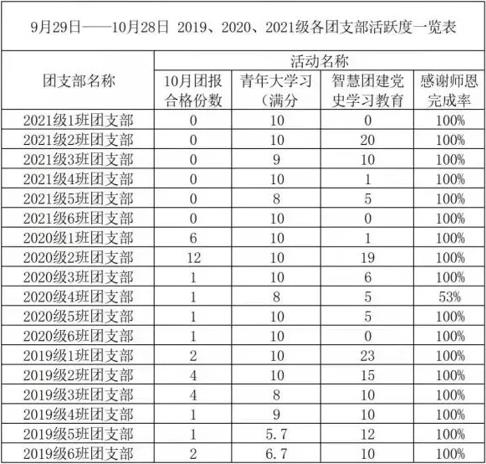 哈喽!各位小伙伴大家好,截止至本月28日各团支部积极参加学校团委及学院团委组织开展的活动情况公示来啦,各积极活跃参与的团支部继续保持、再创佳绩,具体情况如下: